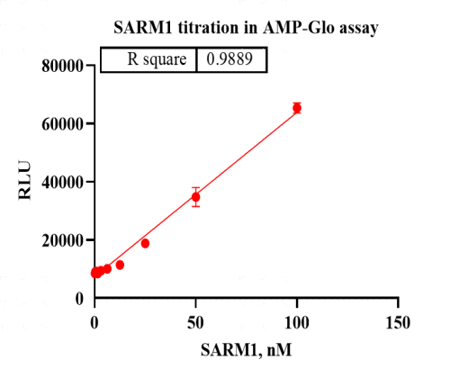 Activity Identification:The SARM1 activity was detected using AMP-Glo technology. The reaction was performed by incubating the SARM1 protein, β-NAD and substrate at 25℃ for 90 min, adding AMP-Glo reagent at 25℃ for 40 min, then reading RLU with BMG.