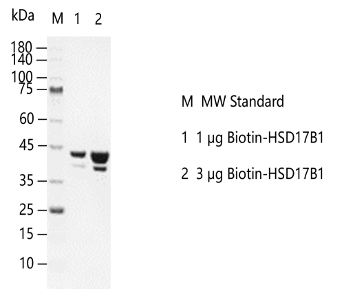 Description:Recombinant human HSD17B1 protein with N-terminal 6x His and Avi tag was biotinylated in vivo. Recombinant human Biotin-HSD17B1 was purified by Ni-NTA affinity and followed by SEC chromatography.