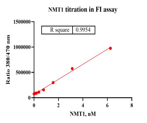Activity Identification:The NMT1 activity was detected by FI assay. The reaction was performed by incubating the NMT1 protein, CMP and myristoylCOA, adding HSPP60SRC(2-9) at 25℃ for 60 min, then reading ratio 620/680 fluorescence signal with BMG.
