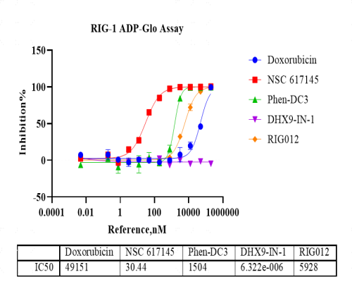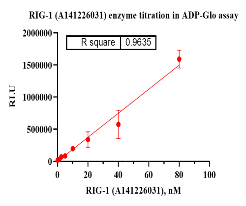 Activity Identification:The RIG-I activity was quantified using the ADP-Glo™ assay. The reaction was performed by incubating the RIG-I protein, ATP and substrate at 25℃ for 60 min, adding ADP-Glo reagent and then measuring luminescence signal on BMG.