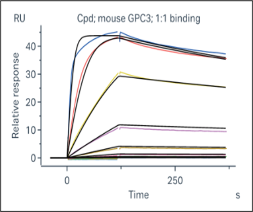 Activity Identification:The Biotin-GPC3 activity was quantified using a SPR-based assay. The Biotin-GPC3 protein was immobilized onto the CM5 chip. The varying concentration of Cpd was injected, and flowed over onto the Biotin-GPC3 protein surface. And the response signal was recorded in real time. The kinetics fitting was as follows with a kD value of ~ 5.90x10-9 M.