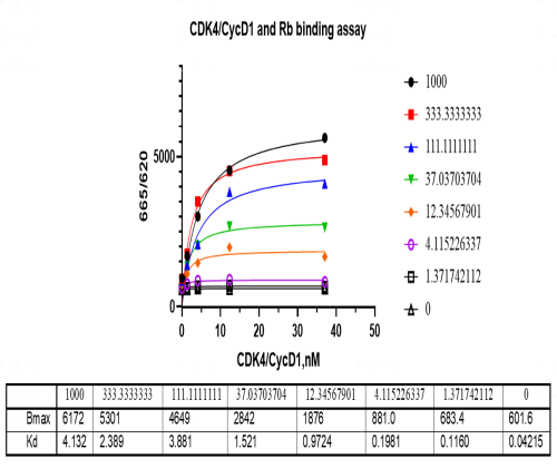 Activity Identification:The RB1 activity was quantified using a binding assay. The reaction was performed by incubating the CDK4/CycD1 protein, RB1 and Anti-6His mAb Tb-Conjugate & Anti-GST mAb XL665-Conjugate solution at 25℃ for 60 min, finally measuring the 665nm/620nm fluorescence signal ratio on BMG.