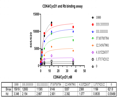Activity Identification:The RB1 activity was quantified using a HTRF-based assay. The reaction was performed by incubating the CDK4/CycD1 protein, RB1 and Anti-6His mAb Tb-Conjugate & Anti-GST mAb XL665-Conjugate solution at 25℃ for 60 min, finally measuring the 665nm/620nm fluorescence signal ratio on BMG.