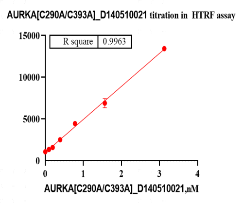 Activity Identification:The AURKA[C290A/C393A] activity was quantified using a HTRF-based assay. The reaction was performed by incubating the AURKA[C290A/C393A] protein, ATP and substrate at 25℃ for 60 min, then adding the donor and receptor, and keeping the mixture at 25℃ for 60 min, finally measuring the 665nm/620nm fluorescence signal ratio on BMG.