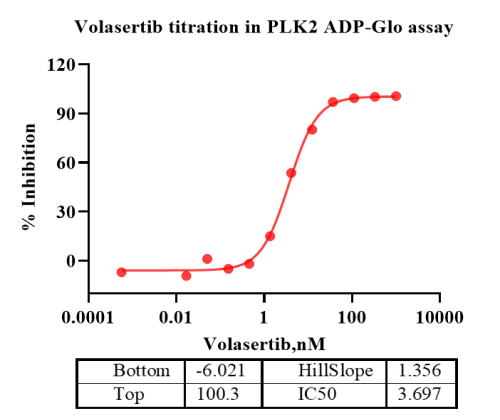 Activity Identification:The PLK2 activity was detected using Ultra Luminescence technology. The reaction was performed by incubating the PLK2 protein, ATP and substrate at 25℃ for 60 min, then adding ADP-Glo reagent and reading RLU signal with BMG.