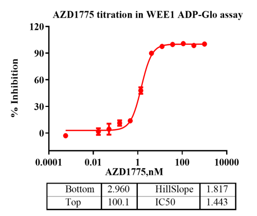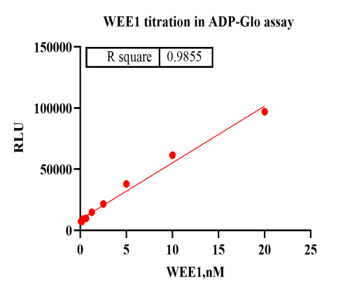 Activity Identification:The WEE1 activity was detected using Ultra Luminescence technology. The reaction was performed by incubating the WEE1 protein, ATP and substrate at 25℃ for 60 min, then adding ADP-Glo reagent and reading RLU signal with BMG.