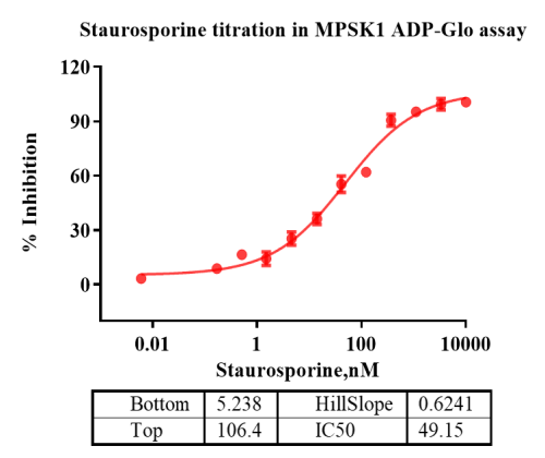 Activity Identification:The MPSK1 activity was detected using Ultra Luminescence technology. The reaction was performed by incubating the MPSK1 protein, ATP and substrate at 25℃ for 60 min, then adding ADP-Glo reagent and reading RLU signal with BMG.