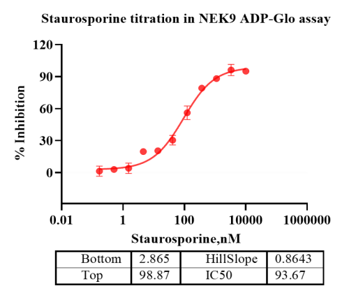 Activity Identification:The NEK9 activity was detected using Ultra Luminescence technology. The reaction was performed by incubating the NEK9 protein, ATP and substrate at 25℃ for 60 min, then adding ADP-Glo reagent and reading RLU signal with BMG.