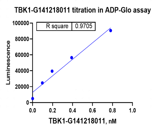 Activity Identification:The TBK1 kinase activity was quantified using the ADP-Glo™ assay. The reaction was performed by incubating the TBK1 protein, ATP and substrate at 25℃ for 60 min, adding ADP-Glo reagent and then measuring luminescence signal on BMG.