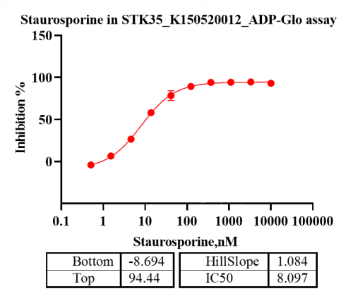 Activity Identification:The STK35 kinase activity was quantified using the ADP-Glo™ assay. The reaction was performed by incubating the STK35 protein, ATP and substrate at 25℃ for 60 min, adding ADP-Glo reagent and then measuring luminescence signal on BMG.