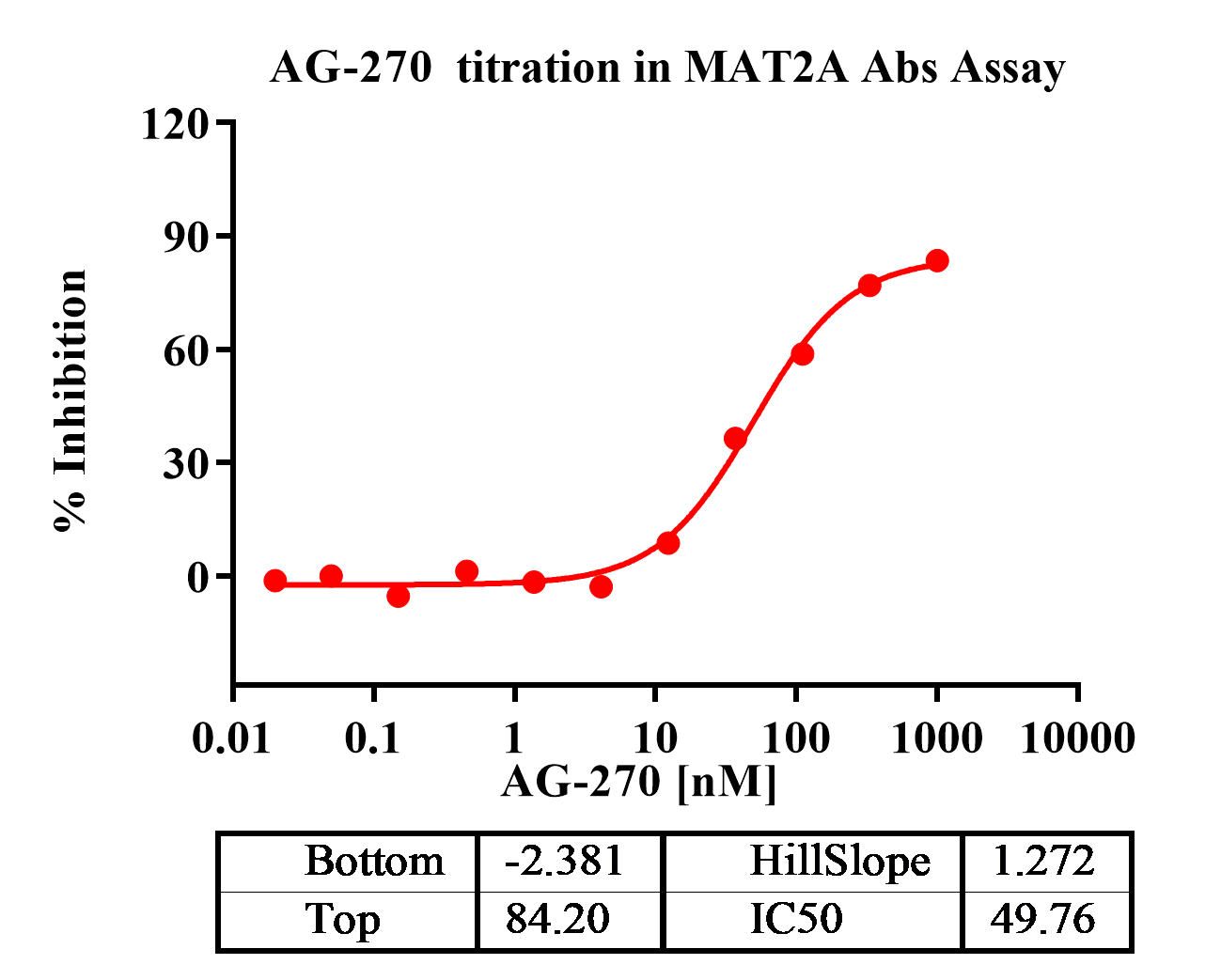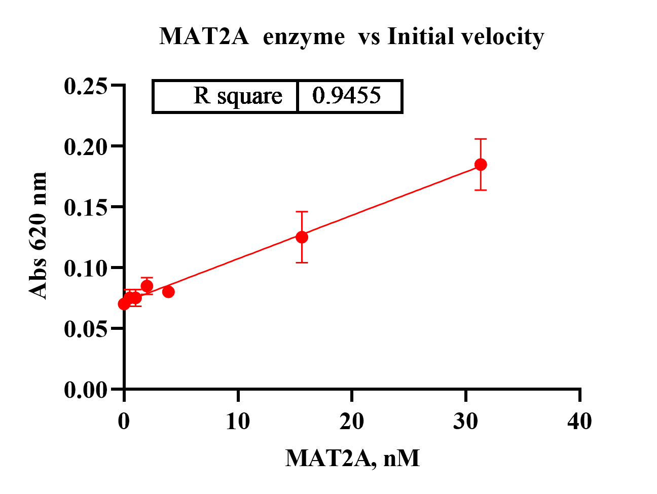 Activity Identification:The MAT2A activity was detected using Absorbance technology. The reaction was performed by incubating the MAT2A protein, substrate at 25℃ for 60 min, then reading OD620 with BMG.