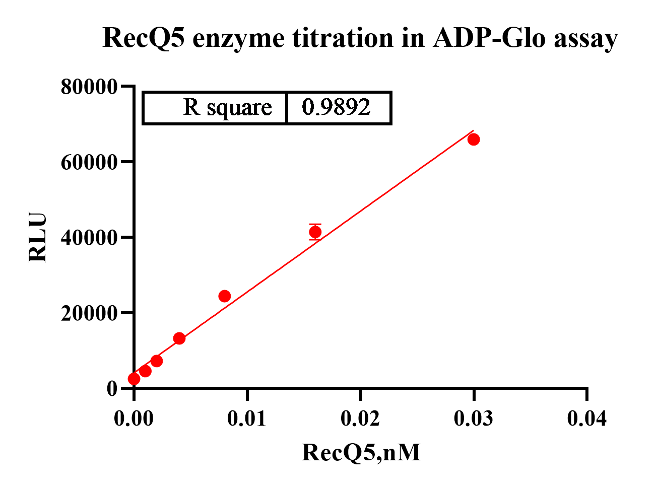 Activity Identification:The RecQ5 activity was detected using Ultra Luminescence technology. The reaction was performed by incubating the RecQ5 protein, ATP and substrate at 25℃ for 60 min, then adding ADP-Glo reagent and reading RLU with BMG.
