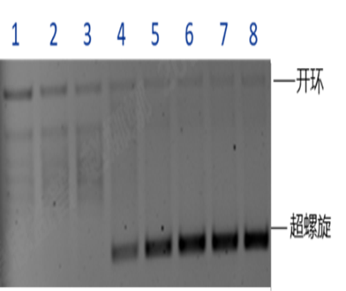 Activity Identification:The Biotin-TOP1 activity was detected by DNA relaxation assay. The reaction was performed by incubating the Biotin-TOP1 protein and plasmid TR-pBR322 at 37℃ for 10 min, then adding 10% SDS and protease K working solution, and mix them at 37℃ for 30 min and adding the mixture of chloroform : isoamylol (24:1) and invert and mix well, and then remove the supernatant after standing then the agarose gel electrophoresis and band analysis.