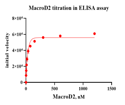 Activity Identification:The MacroD2 activity was assayed with ELISA. The reaction was performed by: 1). SRPK2 protein was coated on a 384-well plate. 2). A biotinylated NAD+ mix is incubated with varying different concentration of the PARP10 and MacroD2 protein. 3). The plate was treated with streptavidin-HRP followed by addition of the ELISA ECL substrate to produce chemiluminescence. Finally, measured the signal using a chemiluminescence reader.