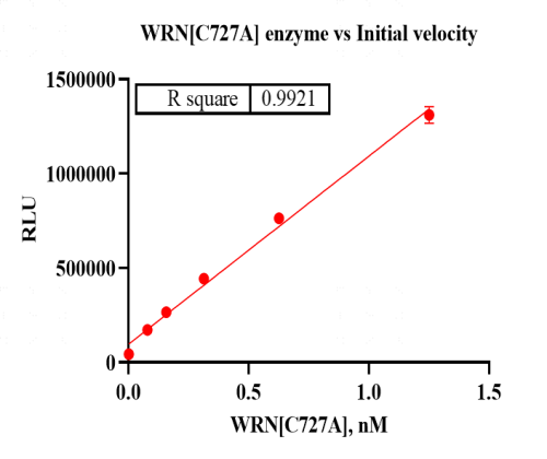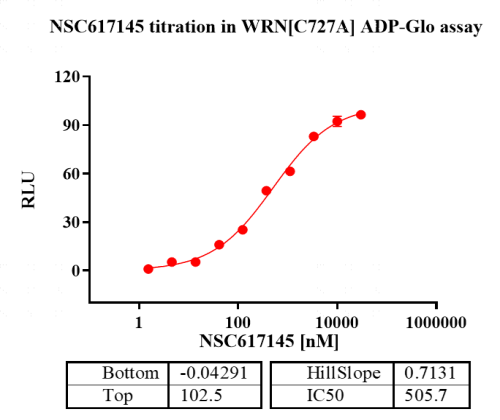 Activity Identification:The WRN[C727A] activity was quantified using the ADP-Glo™ assay. The reaction was performed by incubating the WRN[C727A] protein, ATP and substrate at 25℃ for 60 min, adding ADP-Glo reagent and then measuring luminescence signal on BMG.