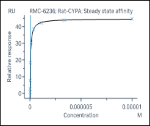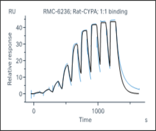 Activity Identification:The CypA activity was quantified using a SPR-based assay. The CypA protein was immobilized onto the CM5 chip. The varying concentration of RMC-6236 was injected, and flowed over onto the CypA protein surface. And the response signal was recorded real time. The kinetics fitting was as follows with a kD value of ~ 5.49x10-8 M.