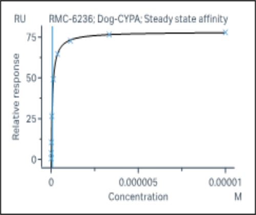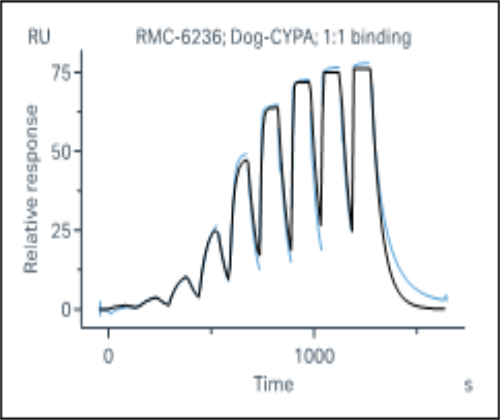 Activity Identification:The CypA activity was quantified using a SPR-based assay. The CypA protein was immobilized onto the CM5 chip. The varying concentration of RMC-6236 was injected, and flowed over onto the CypA protein surface. And the response signal was recorded real time. The kinetics fitting was as follows with a kD value of ~ 7.42x10-8 M.
