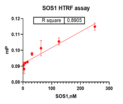 Activity Identification:The SOS1 activity was quantified using a HTRF-based assay. The reaction was performed by incubating the SOS1 protein and substrate, the donor and receptor at 25℃ for 60 min, then measuring the 665nm/620nm fluorescence signal ratio on BMG.
